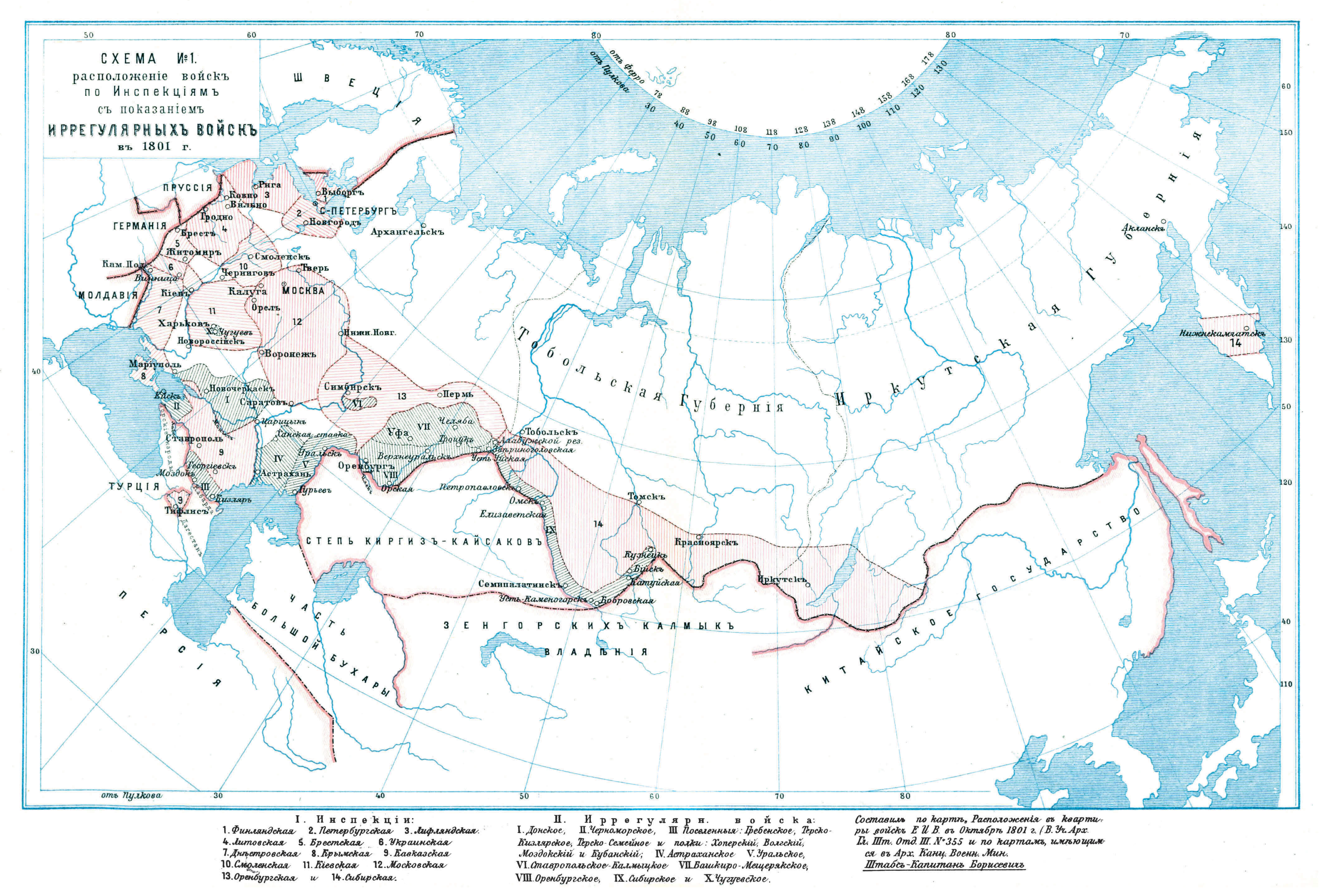Расположение войск по Инспекциям с показанием Иррегулярных войск в 1801 году