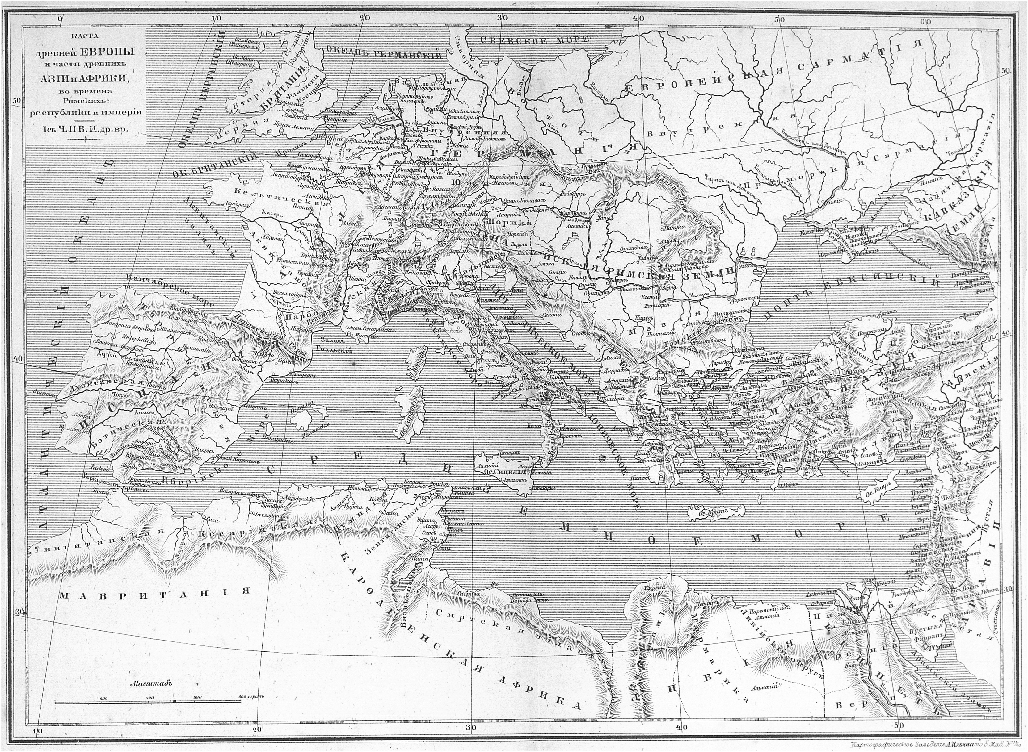 Карта древней Европы и части древних Азии и Африки во времена Римских: республики и империи.