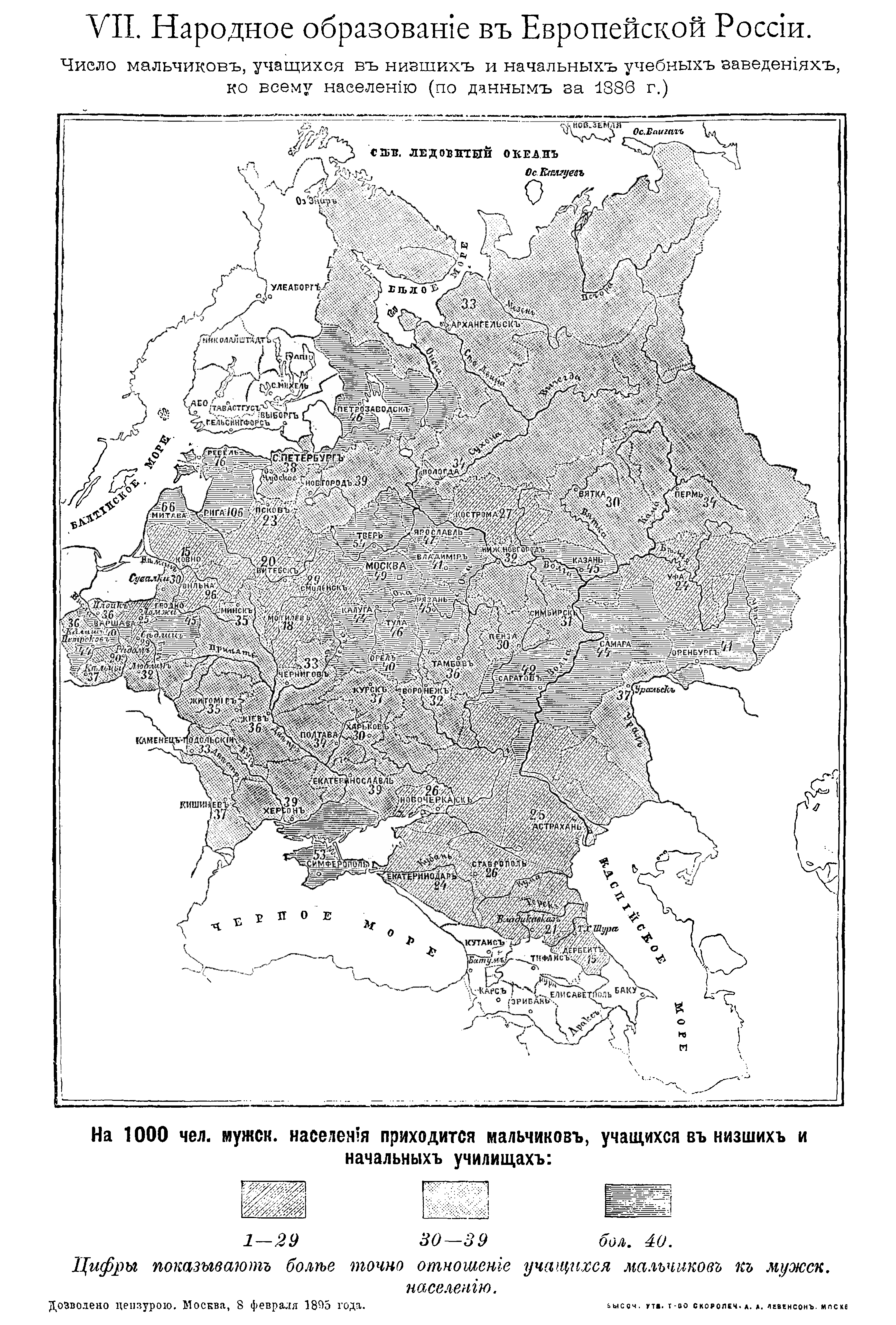 Народное образование в Европейской России. Число мальчиков, учащихся в низших и начальных учебных заведениях ко всему населению (по данным за 1886 год)
