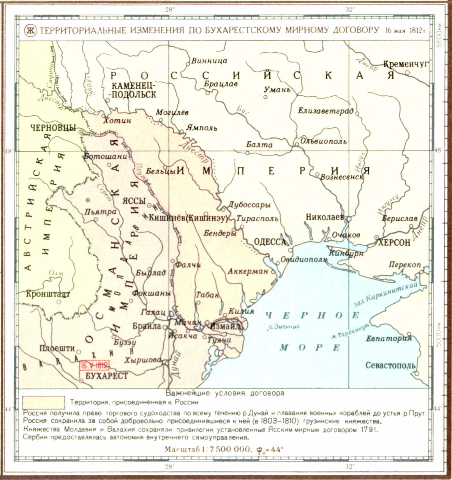 Русско-турецкая война 1806-1812 гг. (Ж) Территориальные изменения по Бухарестскому мирному договору 16 мая 1812 г.