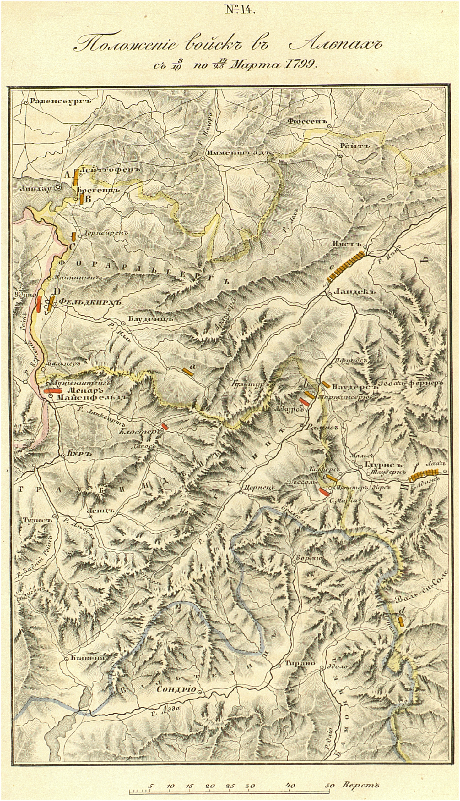 Положение войск в Альпах с 9 по 14 марта 1799 года