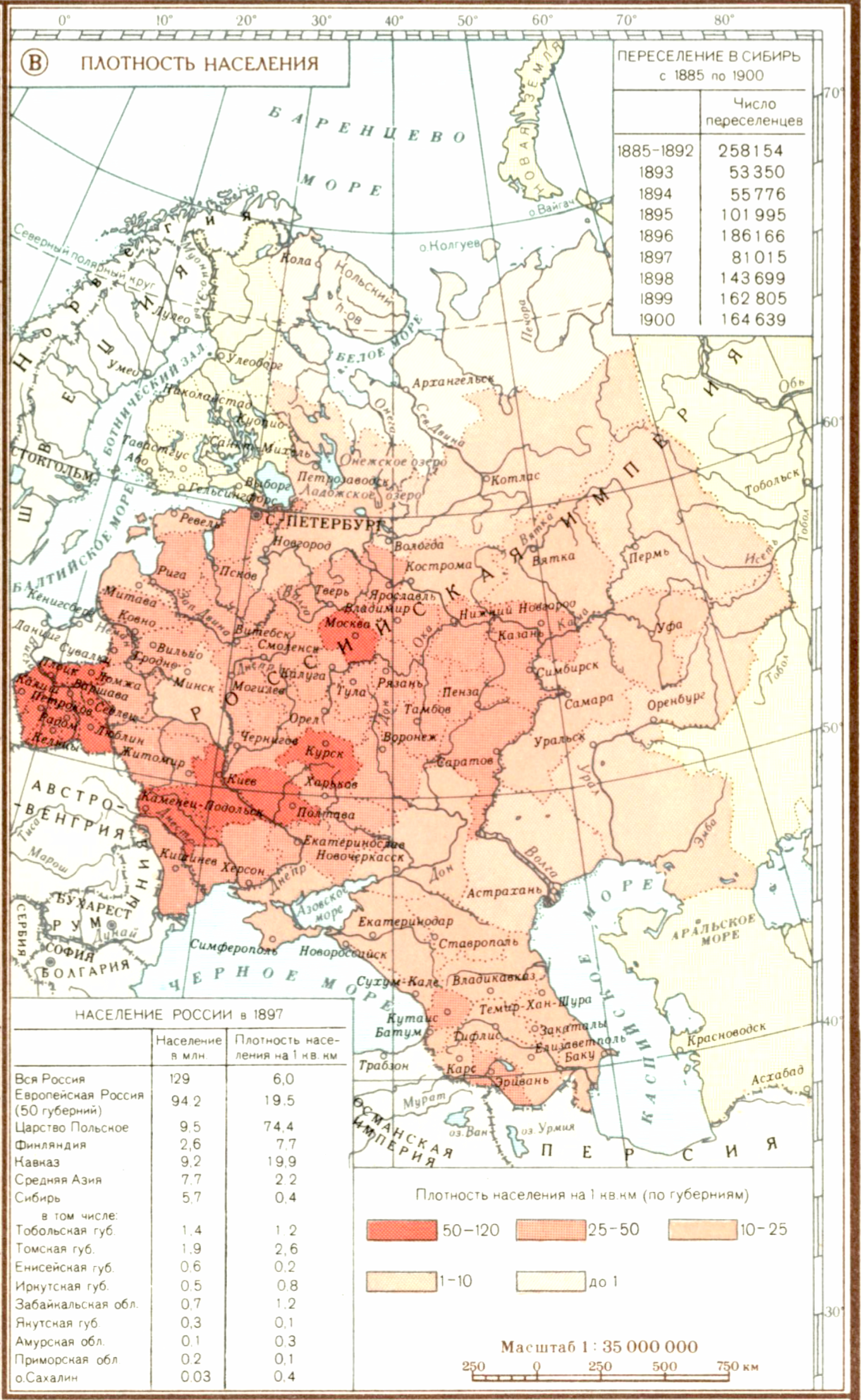 Военно-экономическая карта России к концу XIX века. (В) Плотность населения.
