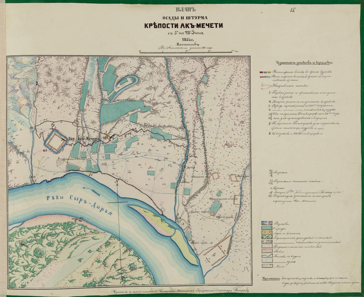 Эта топографическая карта представляет собой план сражения, использовавшийся русской армией при осаде и штурме крепости Ак-Мечеть на реке Сырдарья (современный город Кызылорда в Казахстане). Карта была начерчена и раскрашена классным топографом губернским секретарем Петровым и входит в историческую часть "Туркестанского альбома" — всестороннего исследования Центральной Азии, предпринятого после того как в 1860‑х годах в регионе установилось господство Российской империи. Альбом, созданный по распоряжению генерала Константина Петровича фон Кауфмана (1818–1882 гг.), первого генерал-губернатора российского Туркестана, состоит из четырех частей в шести томах: "Часть археологическая" (два тома), "Часть этнографическая" (два тома), "Часть промысловая" (один том) и "Часть историческая" (один том). Первые три части работы составлены русским востоковедом Александром Людвиговичем Куном при помощи Николая Венедиктовича Богаевского. Альбом был подготовлен и издан в 1871–1872 гг. Четвертая часть составлена русским военным офицером, востоковедом, языковедом и писателем Михаилом Африкановичем Терентьевым (родился в 1837 г.), который принимал участие в русской экспедиции в Самарканд в 1867–1868 гг.