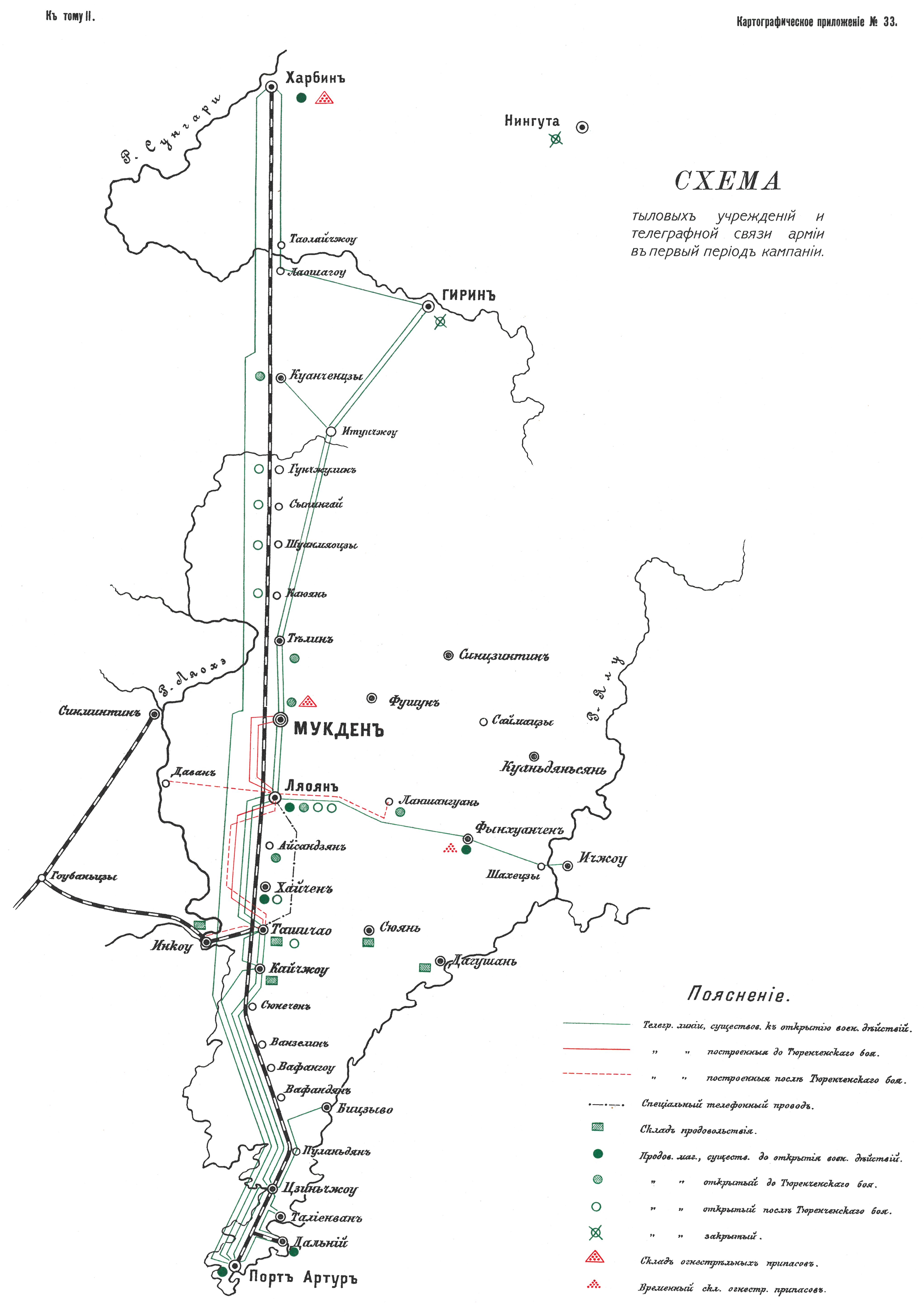 Расположение тыловых учреждений и телеграфной линии связи армии в первый период кампании