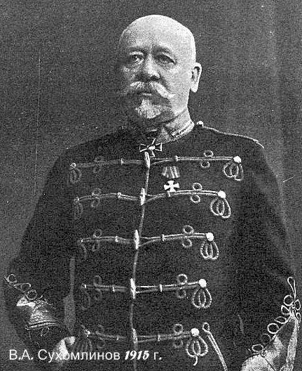 (4.08.1848—2.02. 1926), военный и государственный деятель, генерал от кавалерии (1906). Окончил Николаевское кавалерийское училище (1867) и Академию Генерального штаба (1874). Участник русско-турецкой войны 1877—78, командовал кавалерийским полком и дивизией, был начальником Офицерской кавалерийской школы (1886—97). Написал ряд статей и брошюр (под псевдонимами «Шпора» и О. Бондаренко) по учебным, административным и бытовым вопросам армии. С 1899 служил в Киевском военном округе: начальником штаба, помощником командующего (с 1902) и командующим войсками (с 1904), одновременно с 1905 являлся киевским, волынским и подольским генерал-губернатором. В дек. 1908 был назначен начальником Генерального штаба, в марте 1909 — военным министром. Провел ряд военных реформ, поднявших боеспособность армии. После военных неудач 1915 под влиянием масонских интриг в июне был снят с должности, а в марте 1916 — арестован. Сухомлинова фальсифицировано обвиняли в злоупотреблениях и измене в связи с осуждением за шпионаж некоторых лиц из его окружения. После 6-месячного заключения был переведен под домашний арест, но после Февральской революции снова арестован (1 марта 1917). На суде (в авг. — сент. 1917) обвинения в измене и злоупотреблениях не подтвердились, но Сухомлинов был признан виновным в «недостаточной подготовке армии к войне» и приговорен к бессрочной каторге, замененной заключением. 1 мая 1918, как достигший 70 лет, был освобожден по амнистии и эмигрировал в Финляндию, а затем в Германию. Оставил после себя «Воспоминания» (Берлин, 1924).