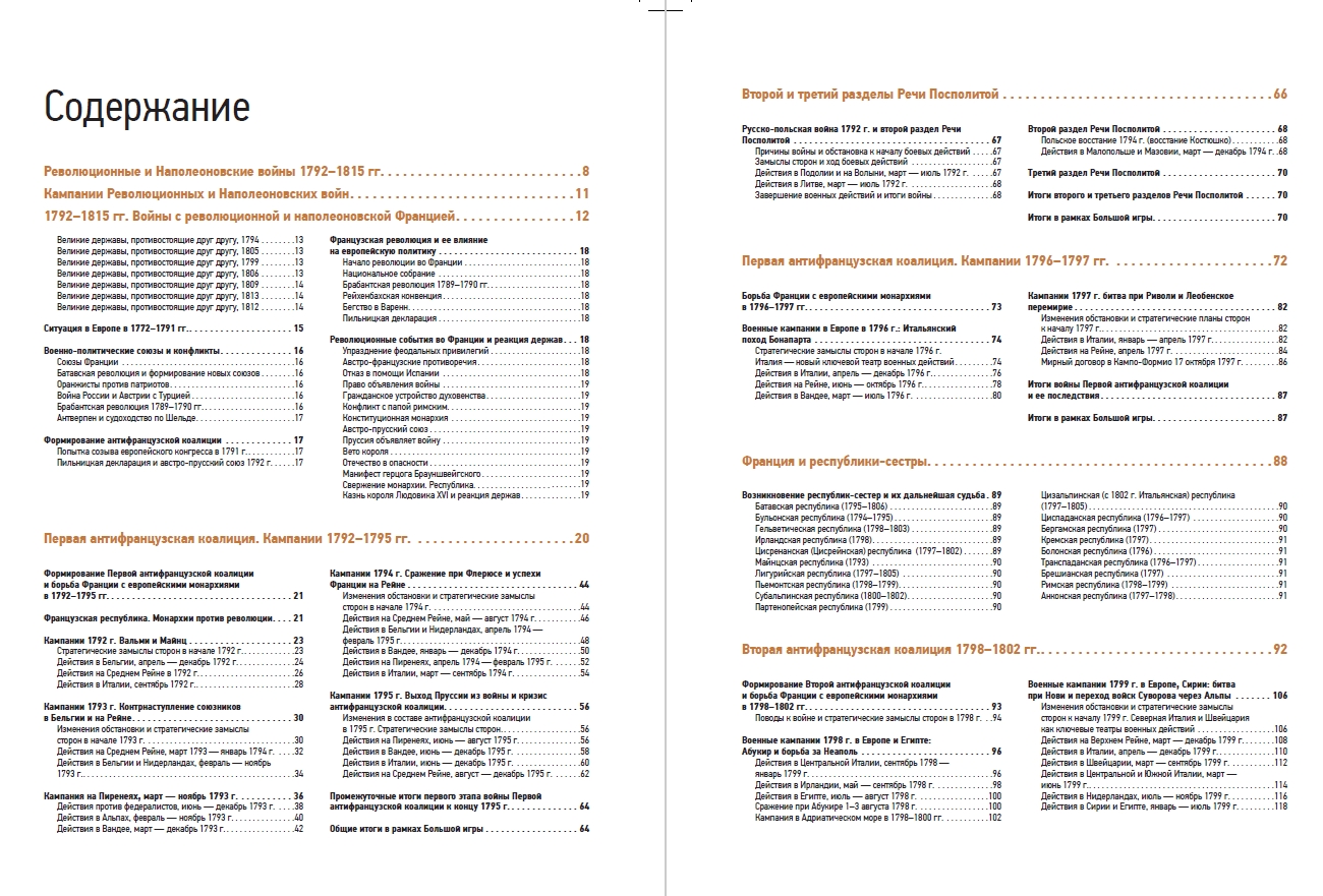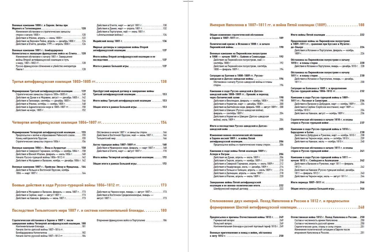 В книге собрано 137 детально проработанных карт, отражающих все военные кампании эпохи — от масштабных наполеоновских походов до малоизвестных, но важных конфликтов: «Апельсиновая война» Португалии и Испании, война Швеции и Норвегии 1814 г., Русско-турецкая война 1806–1812 гг., война Неаполя и Австрии 1815 г. и многие другие.
