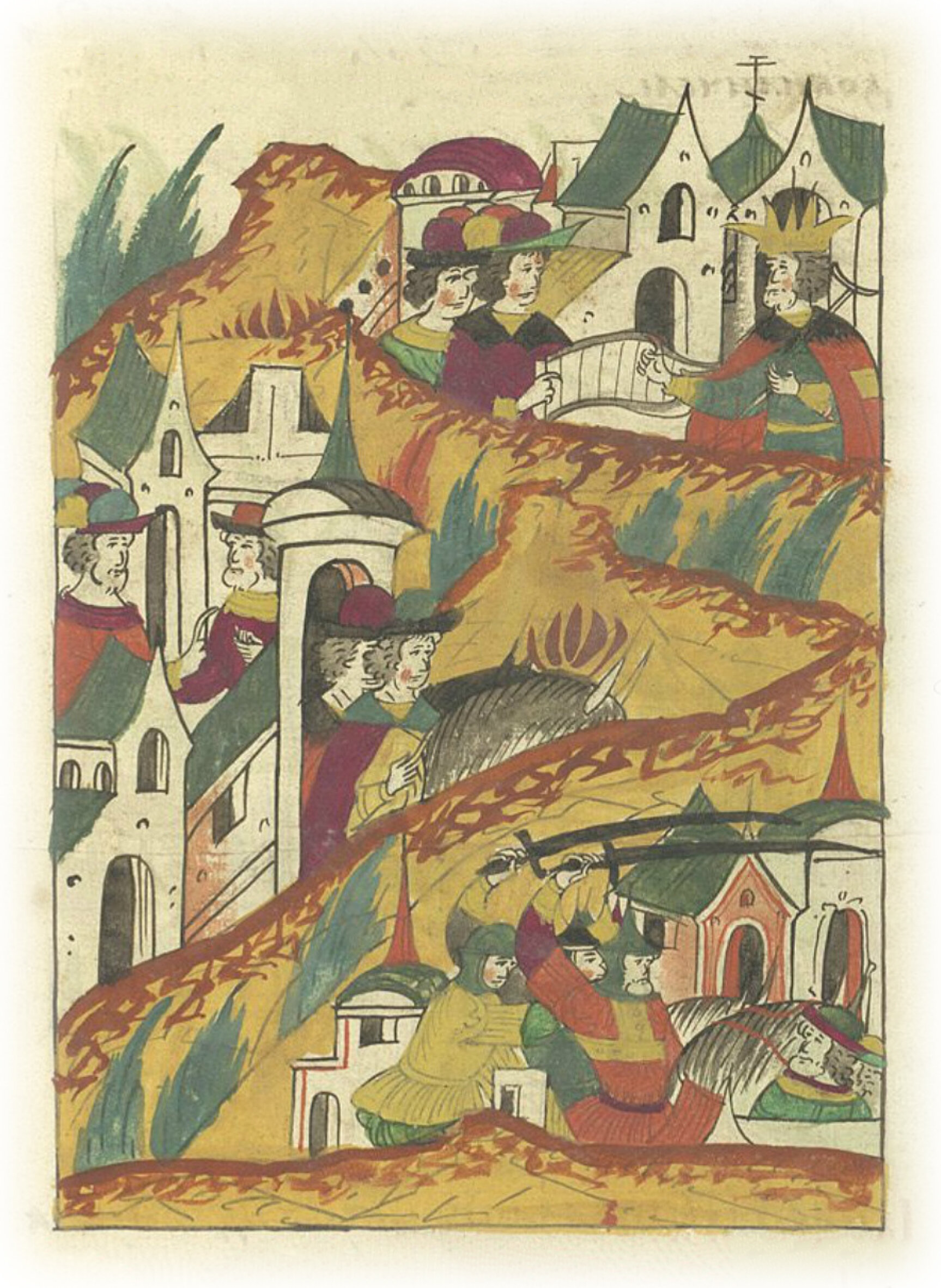 Аналогичное значение бояр как верхушки дружины прослеживается и в других известиях XII столетия. В 1167 г. князь Владимир Мстиславич задумал вступить в борьбу за киевский стол и «посла к Рагуилови Добрыничу, и къ Михалеви, и къ Завидови, являя имъ думу свою. И рекоша ему дружина его: “А соб. еси, княже, замыслилъ, а не .дем по тоб.. Мы того не в.дали”. Володимиръ же рече, възревъ на д.цкыя: “А се будуть мои бояре!”»28. Названные поименно лица определены как «дружина»; далее выясняется, что на совещании присутствовали «детские»29: князь выражает намерение сделать их боярами вместо тех, кто отказал ему в поддержке. Рагуил, Михаль и Завид были, следовательно, боярами, и они названы «дружиной». В то же время, поскольку «детских» князь намеревался объявить не «дружиной», а именно «боярами», очевидно, подразумевается, что «детские» тоже входят в дружину. Следовательно, последняя состоит, как минимум, из двух частей, при этом главной ее составляющей мыслятся опять-таки бояре.