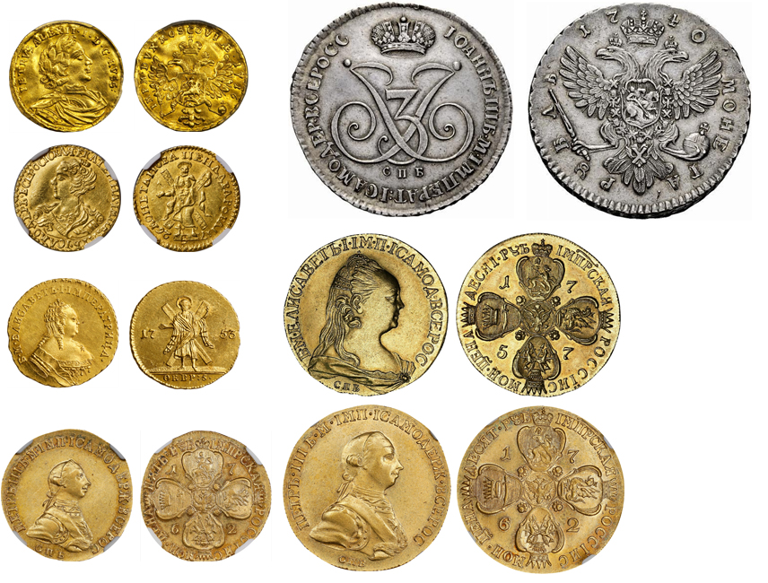 В общем и целом, до реформы Витте, а затем и до большевиков, денежная революция Петра I была самым значимым событием в истории российской денежной системы, которая кровь из носу назревала и таки была успешно осуществлена. Забавно, что за почти сто лет до Французской революции, первой, уничтожившей каролингскую систему 1:20:240 в Европе и перешедшей на современную 1:100 аналогичный процесс в России проделал Петр, но, как мы теперь понимаем, это было обусловлено традицией торгового Новгорода еще XV в. Петр подарил миру многие нумизматические ценности высшего класса, такие, как первый золотой червонец 1701 г., ранний рубль 1704 г., гривенник с точками 1726 г., копейка-плитка того же года (стоят они, кстати, в разы дороже банальных золотых дукатов, плиток сохранилось всего около 10), но запомним мы его, прежде всего, как выдающегося и тонкого реформатора денежной системы. Принципиально в ней до Витте ничего не поменялось, так что просто перечислим наиболее примечательные денежки следующих императоров.