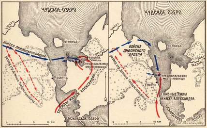 Правое крыло защищала покрытая слабым льдом Си-говица. Перед левым был далекий ледяной обзор. Наступающее по открытому льду немецкое войско было как на ладони, полностью обнаруживая свои силы, построение и направление удара.