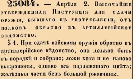 25084. 1851 год. 14 апреля (2 апреля ст.ст.) Высочайше утвержденная Инструкция для сдачи оружия, бывшаго в употреблении, от полков обратно в артиллерийское ведомство. №1 При сдаче войсками оружия обратно в артиллерийское ведомство. Оно должно быть в порядке и собрано; ложи хотя и не наново выкрашены, однако ж надлежащаго цвета; железныя части без большой ржавчины. При приеме оружия от войск, оно разбирается; части пересматриваются и принимаются или отвергаются <…>
