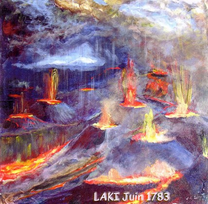 В 1783 году произошло извержение вулкана Лаки в Исландии, погибло более 10 тысяч человек«Лаки (вулканическая цепь). Лаки (Laki), вулканическая цепь на Ю. Исландии, близ юго-западного края ледника Ватнайёкудль. Высота до 818 метров. Состоит из 115 кратеров, простирающихся на 25 километров вдоль тектонического разлома. Сильное извержение в 1783-84, во время которого было выброшено 12,2 км3 лавы (образовалось лавовое поле площадью 565 км2); 0,3 км3 вулканического пепла, осевшего на площади ...