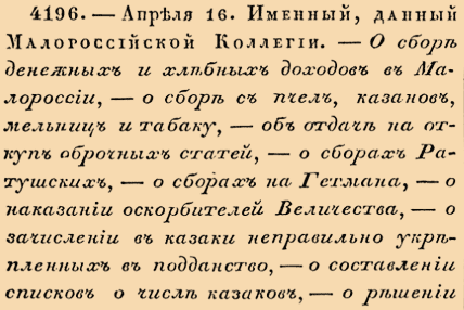 4196. 1723 год. 27 апреля (16 апреля ст.ст.) Именный, данный Малороссийской Коллегии. О сборе денежных и хлебных доходов в Малороссии, о сборе с пчел, казанов, мельниц и табаку, об отдаче на откуп оброчных статей, о сборах Ратушских, о сборах на Темана, о наказании оскорбителей Величества, о зачислении в казаки неправильно укрепленных в подданство, о составлении списков о числе казаков, о решении всех дел Малороссийских особой Коллегии и об уничтожении разных незаконных и обременительных поборов.