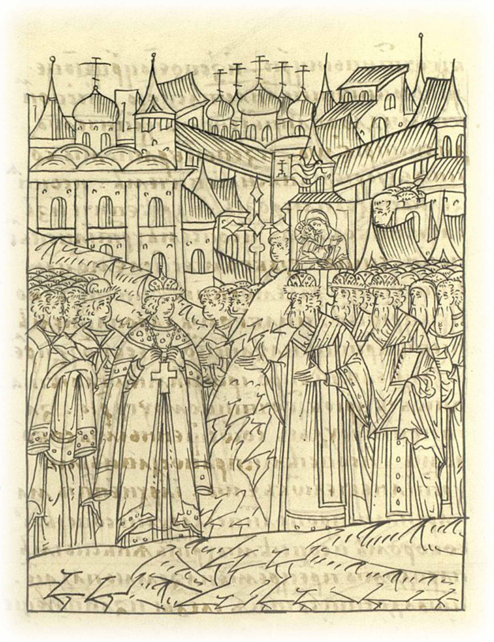 И тут царь благочестивый переменил воинскую одежду и возложил на себя царское одеяние: положил на шею свою и на грудь животворящий крест и на голову свою шапку Мономаха, то есть венец царский, а на плечи диадему.