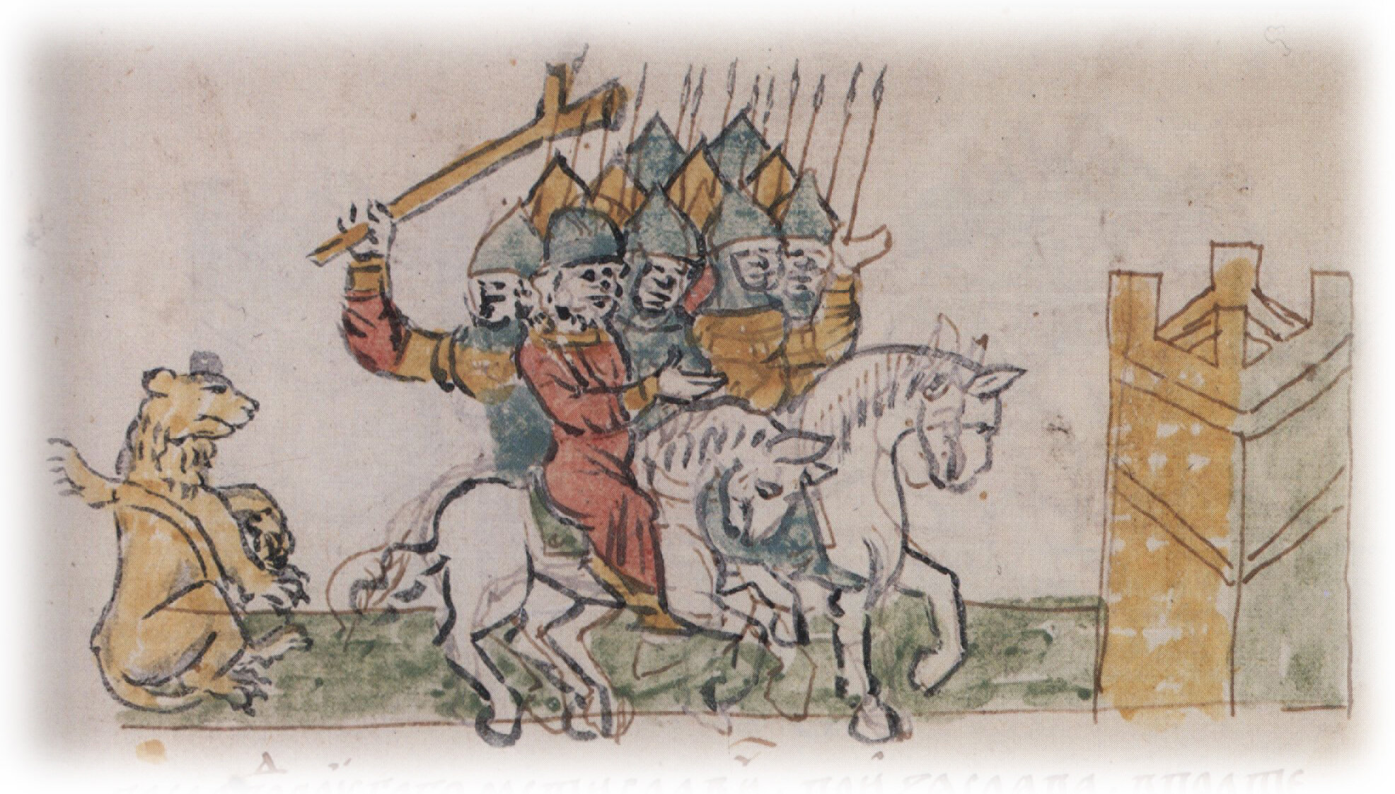 Вступление войска Ярополка Владимировича Киевского в Псрсяславль, находившийся в течение 8 дней в руках Юрия Владимировича Долгорукого (Ростовского), слева — аллегорическое изображение герба Долгоруких.