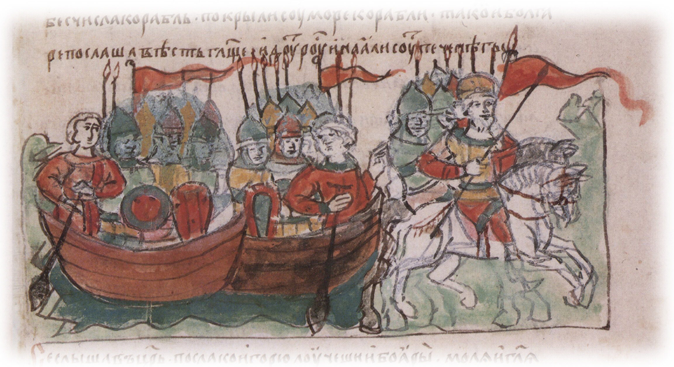 Лета 6452. Игорь совокупи вой многи: варягы, и русь, и поляны, и словены, и кривичи, и тивиреци, и печенегы наа, и тали у них поя, и поиде на Грекы в лодьях и на конех, хотя мьстити себе".