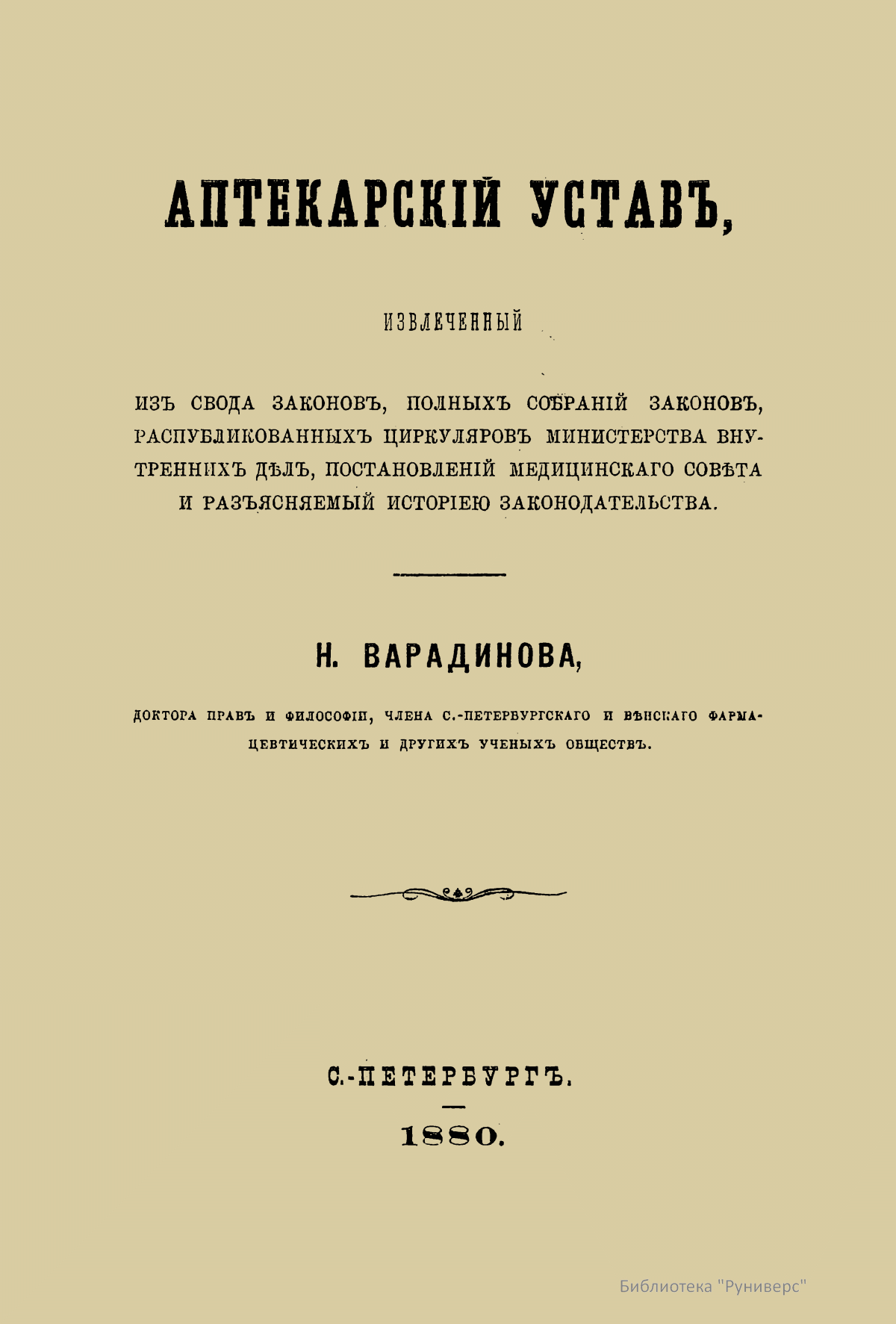 Издание представляет собой фундаментальный труд «Аптекарский устав», составленный доктором прав и философии Н. Варадиновым и изданный в 1880 году в типографии Министерства внутренних дел,.