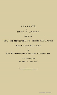 Трактат о мире и дружбе между его величеством императором всероссийским и его величеством королем саксонским заключенный в Вене 6/18 маия 1815.