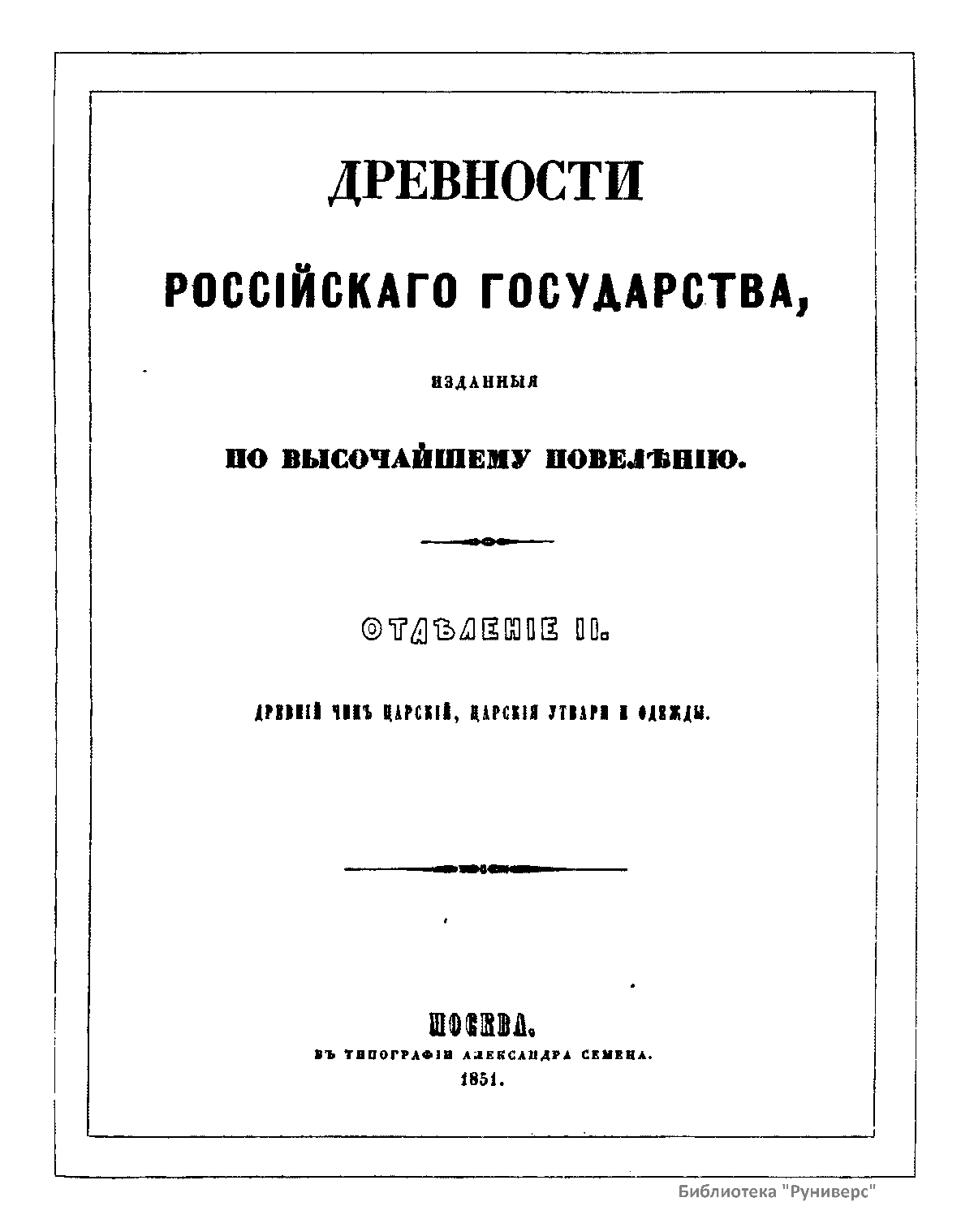 Древности россiйскаго государства. Отдѣленiе II. Древнiй чинъ царскiй, царскiя утвари и одежды