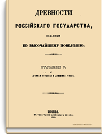 Авторы настоящего издания считают, что время охранения памятников России настало со вступления на престол Императора Николая I. Повелевая хранить памятники и остатки русских древностей, он приказал все, что заслуживает внимание и составляет материал истории, отчетливо срисовать, описать и издать. Император повелел учредить в Москве Комитет издания древностей Российского государства. Первый отдел огромного и великолепного издания «Древности Российского государства» состоит из 500 большого формата рисунков, распределенных по своему содержанию на шесть частей с соответствующим описанием. Первая часть «Древностей» заключает в себе священные памятники: а) образа и кресты, замечательные в историческом и художественном отношении, б) храмовую утварь разных времен, в) облачения духовного сана. Вторая часть содержит древний царский чин, или священное облачение русских великих князей и царей при поставлении на царство. В третьей части представлена древняя броня и оружие. Четвертую часть составляют древние великокняжеские, царские, боярские и местные народные одежды в изображениях и портретах. В пятой части можно увидеть древнюю царскую столовую утварь. Шестая часть состоит из памятников древнего русского зодчества.