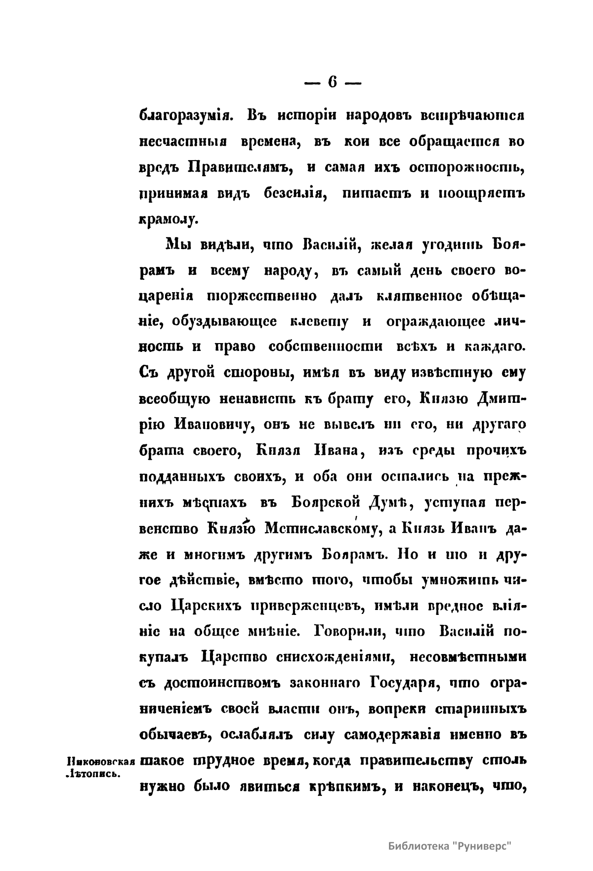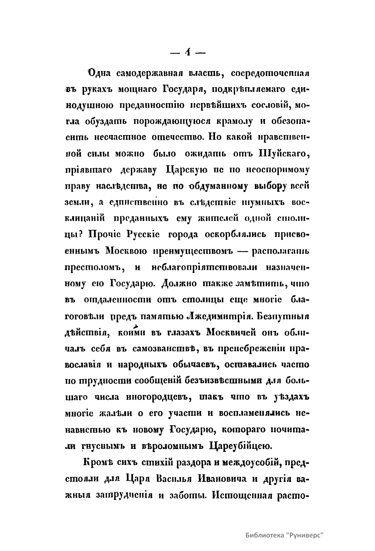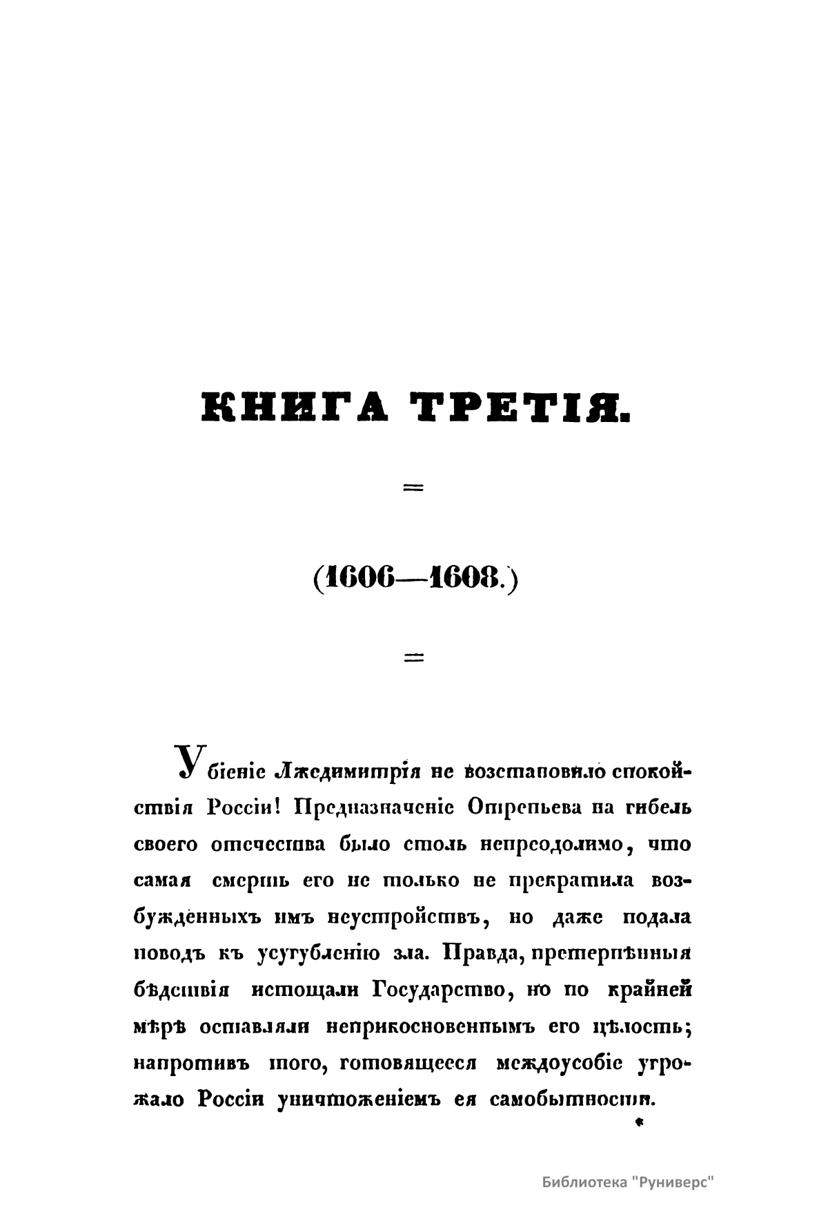 Издание посвящено событиям в России в конце XVI начале XVII в. Первый том заключает две книги. Первая охватывает период с 1584 г. – года смерти Ивана Грозного и вступления на престол Федора Иоанновича – по 1605 г., когда умирает Борис Годунов. Вторая – 1605 – 1606 гг. – время царствования самозванца Лжедмитрия I. В приложении (289) опубликовано 17 документов. Второй том посвящен царствованию Василия Шуйского. Третья книга второго тома охватывает период с 1606-го по 1608 г., когда царские войска были разбиты под Болховом, а около Москвы возник Тушинский лагерь – столица нового претендента на престол Лжедмитрия II. Четвертая – 1608 – 1609 гг. В 1609 г. польские войска осадили Смоленск и дошли до Троице-Сергиева монастыря. В приложении (303) опубликовано 20 документов и план осады Троице-Сергиева монастыря. Пятая книга третьего тома описывает события конца правления Шуйского – 1609 – 1610 гг. и посвящена в основном князю Михаилу Васильевичу Скопину-Шуйскому. Шестая – 1610 г., когда Шуйский был свергнут боярами и насильно пострижен в монахи; власть временно перешла к Семибоярщине – правительству, подписавшему в августе 1610 договор с польским королем Сигизмундом III об избрании Владислава царем при условии, что тот примет православие; в Москву вступили польские войска. В приложении (268) опубликовано 17 документов.