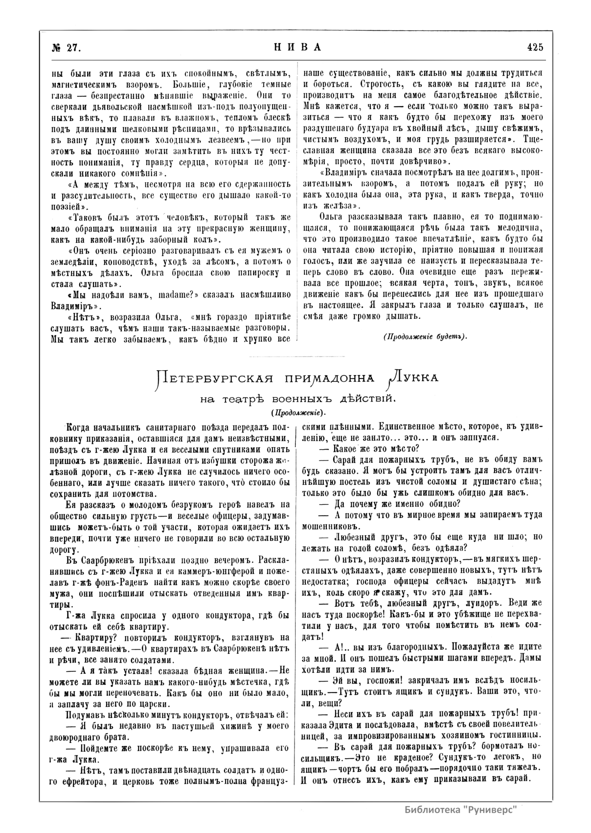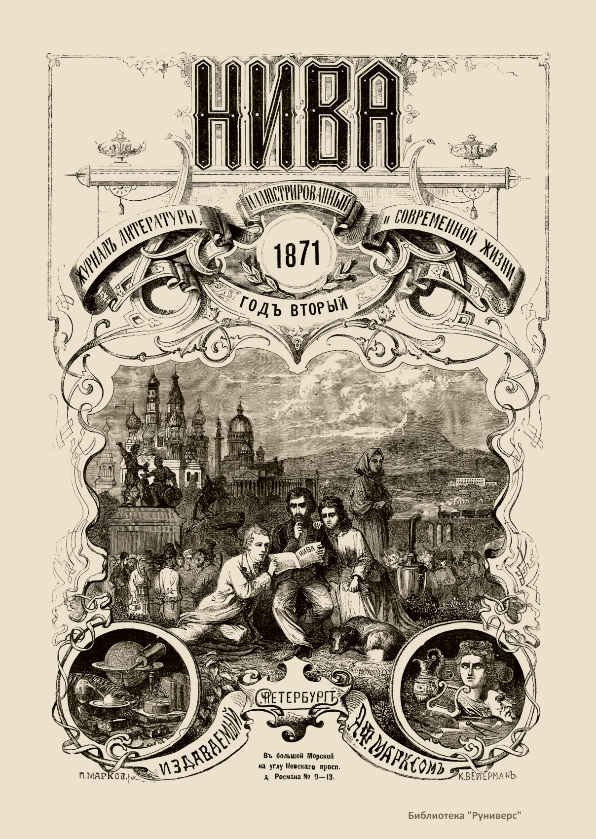 «Нива» — популярный еженедельный русский журнал с приложениями, издававшийся со второй половины XIX до начала XX века, носил подзаголовок «Журнал литературы, политики и современной жизни». Журнал был любимым детищем А. Ф. Маркса, возглавлявшего свое издательство вплоть до своей смерти в 1904 г. Позиционировалась «Нива» как иллюстрированный журнал для семейного чтения и был ориентирован, главным образом, на обывателя. В журнале публиковались литературные произведения, исторические, научно-популярные очерки, репродукции и гравюры картин современных художников. Материалы политического и общественного содержания также сопровождались многочисленными иллюстрациями. Среди известных литераторов, печатавшихся в журнале, были А. К. Толстой, Ф. И. Тютчев, Л. Н. Толстой, А. А. Фет, А. П. Чехов, Максим Горький, Корней Чуковский, Анна Ахматова, Иван Бунин и многие другие. Благодаря «Ниве» сочинения многих современных авторов добрались до самых отдаленных областей России.