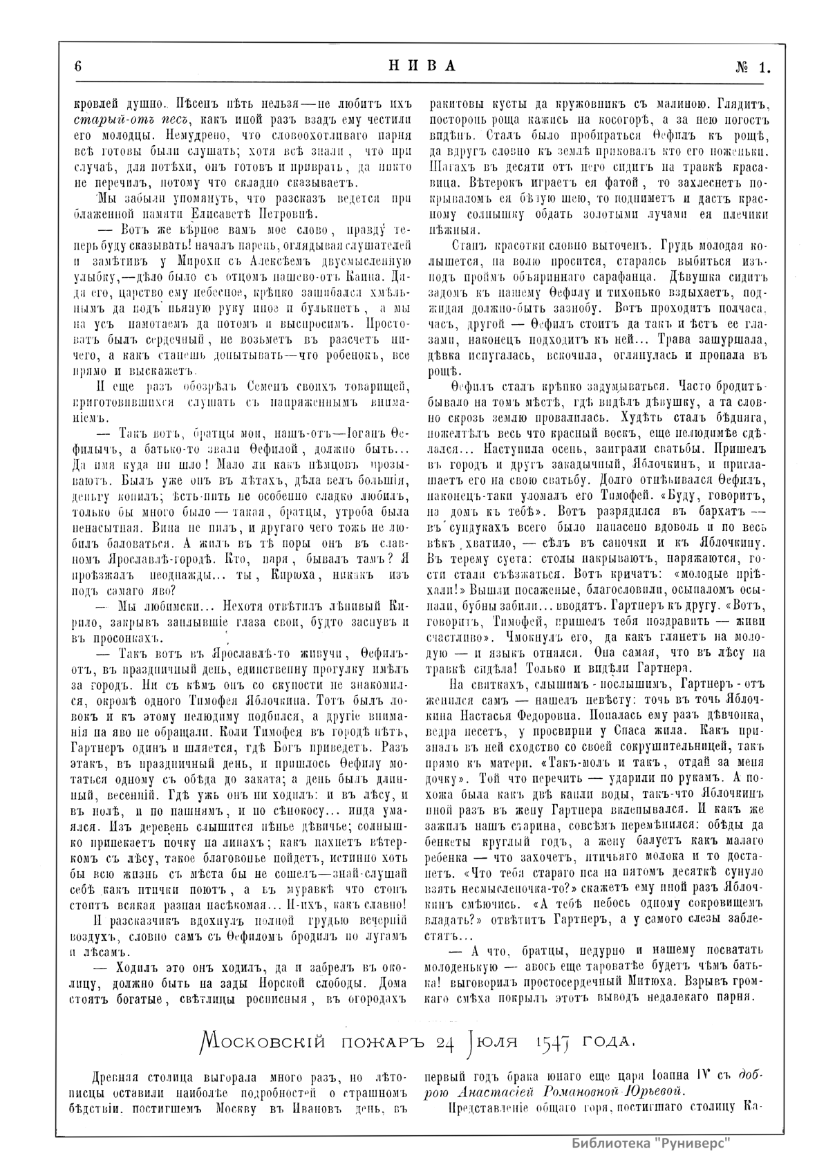 «Нива» — популярный еженедельный русский журнал с приложениями, издававшийся со второй половины XIX до начала XX века, носил подзаголовок «Журнал литературы, политики и современной жизни». Журнал был любимым детищем А. Ф. Маркса, возглавлявшего свое издательство вплоть до своей смерти в 1904 г. Позиционировалась «Нива» как иллюстрированный журнал для семейного чтения и был ориентирован, главным образом, на обывателя. В журнале публиковались литературные произведения, исторические, научно-популярные очерки, репродукции и гравюры картин современных художников. Материалы политического и общественного содержания также сопровождались многочисленными иллюстрациями. Среди известных литераторов, печатавшихся в журнале, были А. К. Толстой, Ф. И. Тютчев, Л. Н. Толстой, А. А. Фет, А. П. Чехов, Максим Горький, Корней Чуковский, Анна Ахматова, Иван Бунин и многие другие. Благодаря «Ниве» сочинения многих современных авторов добрались до самых отдаленных областей России.