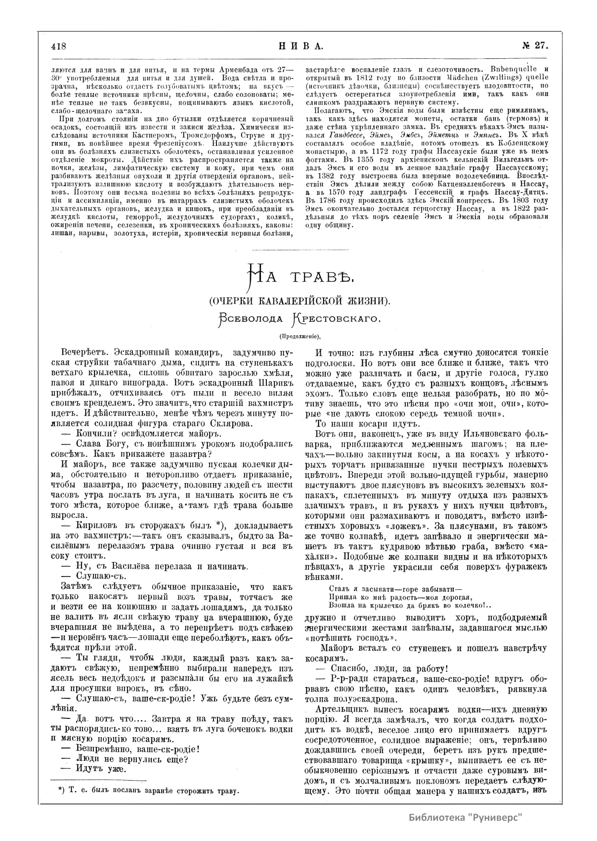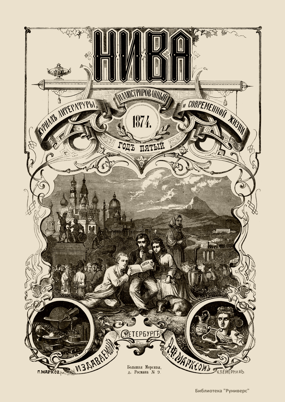 «Нива» — популярный еженедельный русский журнал с приложениями, издававшийся со второй половины XIX до начала XX века, носил подзаголовок «Журнал литературы, политики и современной жизни». Журнал был любимым детищем А. Ф. Маркса, возглавлявшего свое издательство вплоть до своей смерти в 1904 г. Позиционировалась «Нива» как иллюстрированный журнал для семейного чтения и был ориентирован, главным образом, на обывателя. В журнале публиковались литературные произведения, исторические, научно-популярные очерки, репродукции и гравюры картин современных художников. Материалы политического и общественного содержания также сопровождались многочисленными иллюстрациями. Среди известных литераторов, печатавшихся в журнале, были А. К. Толстой, Ф. И. Тютчев, Л. Н. Толстой, А. А. Фет, А. П. Чехов, Максим Горький, Корней Чуковский, Анна Ахматова, Иван Бунин и многие другие. Благодаря «Ниве» сочинения многих современных авторов добрались до самых отдаленных областей России.