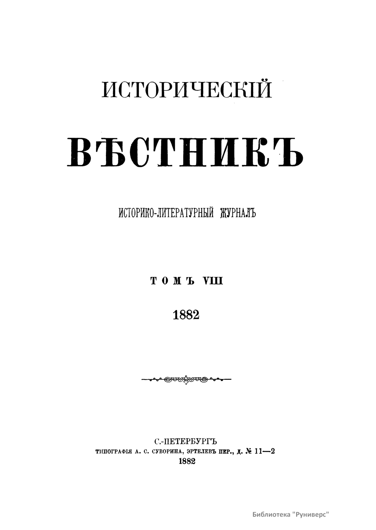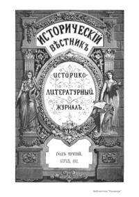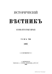 «Исторический вестник» - русский ежемесячный историко-литературный журнал. Издавался в Санкт-Петербурге с 1880-го по 1917 г. Журнал был основан А.С. Сувориным и С.Н. Шубинским с целью «знакомить читателей в живой, общедоступной форме с современным состоянием исторической науки и литературы в России и Европе». Вышло 150 тт. Каждый том состоял из трёх ежемесячных выпусков, имел свою нумерацию страниц, оглавление, список иллюстраций. Журнал приобрёл устойчивую популярность среди читателей, заняв прочное место в «триумвирате» русских исторических журналов наряду с «Русским архивом» и «Русской стариной». опережая их по количеству подписчиков. Отличием «Исторического вестника» было то, что он не помещал на своих страницах необработанных, сырых материалов. С другой стороны, журнал приближался по своему типу к журналам общелитературного образца, сочетая в себе коммерческий успех и доступное изложение материала.
