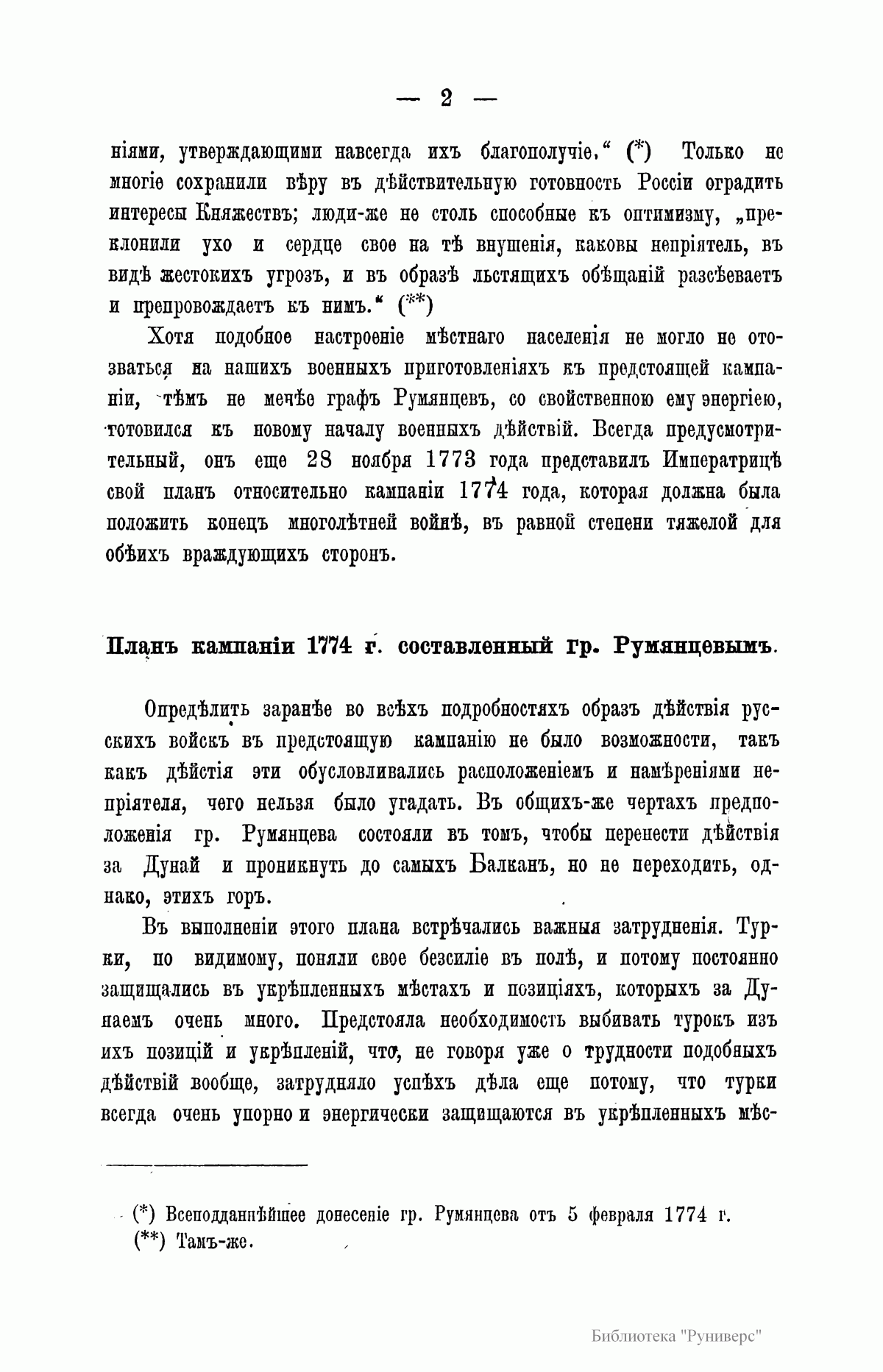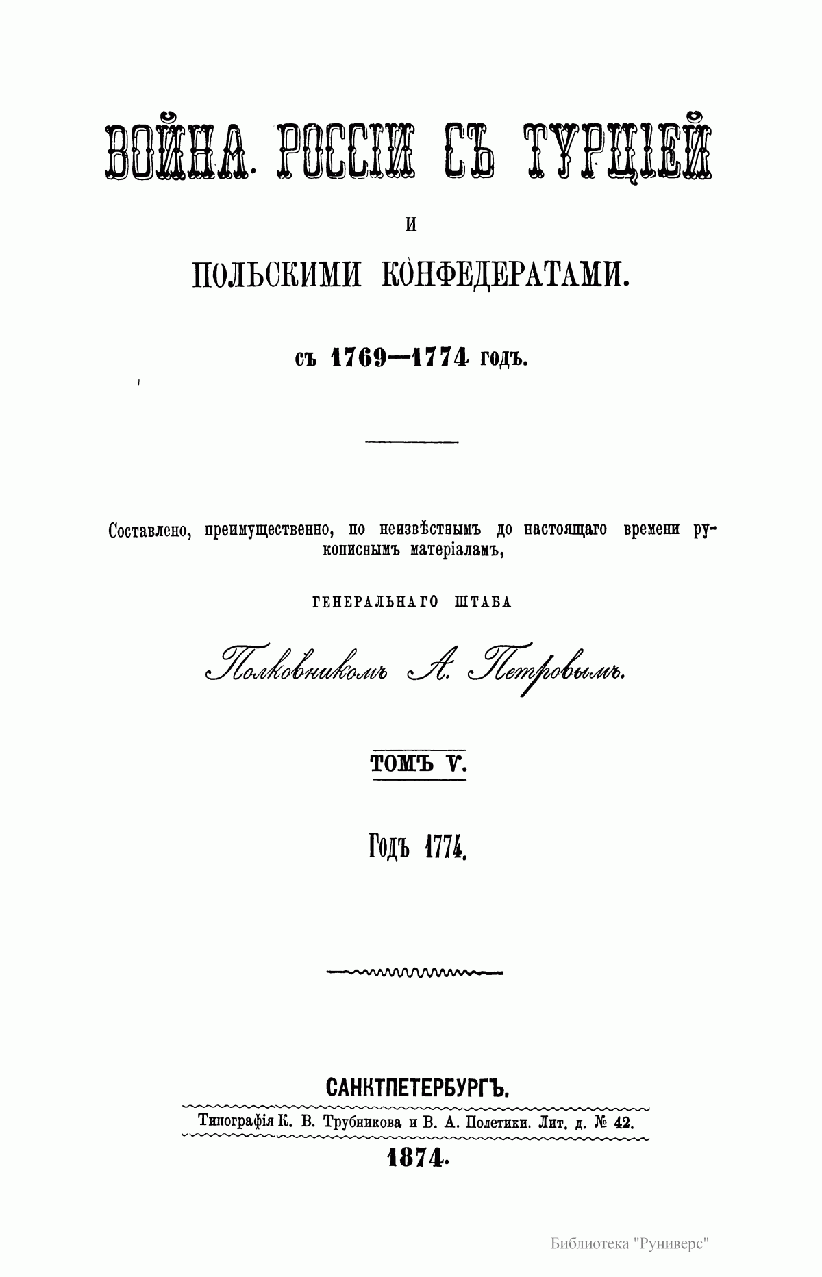 Предпринимая описание первой турецкой войны, в царствование Екатерины II, автор старался изложить военные и политические события того времени с возможною полнотой, насколько это позволяли известные ему рукописные материалы архивов, генерального штаба, государственного и министерства иностранных дел. Петрову посчасливилось одним из первых разбирать дела управления графа Румянцева, только переданные в архив генштаба.