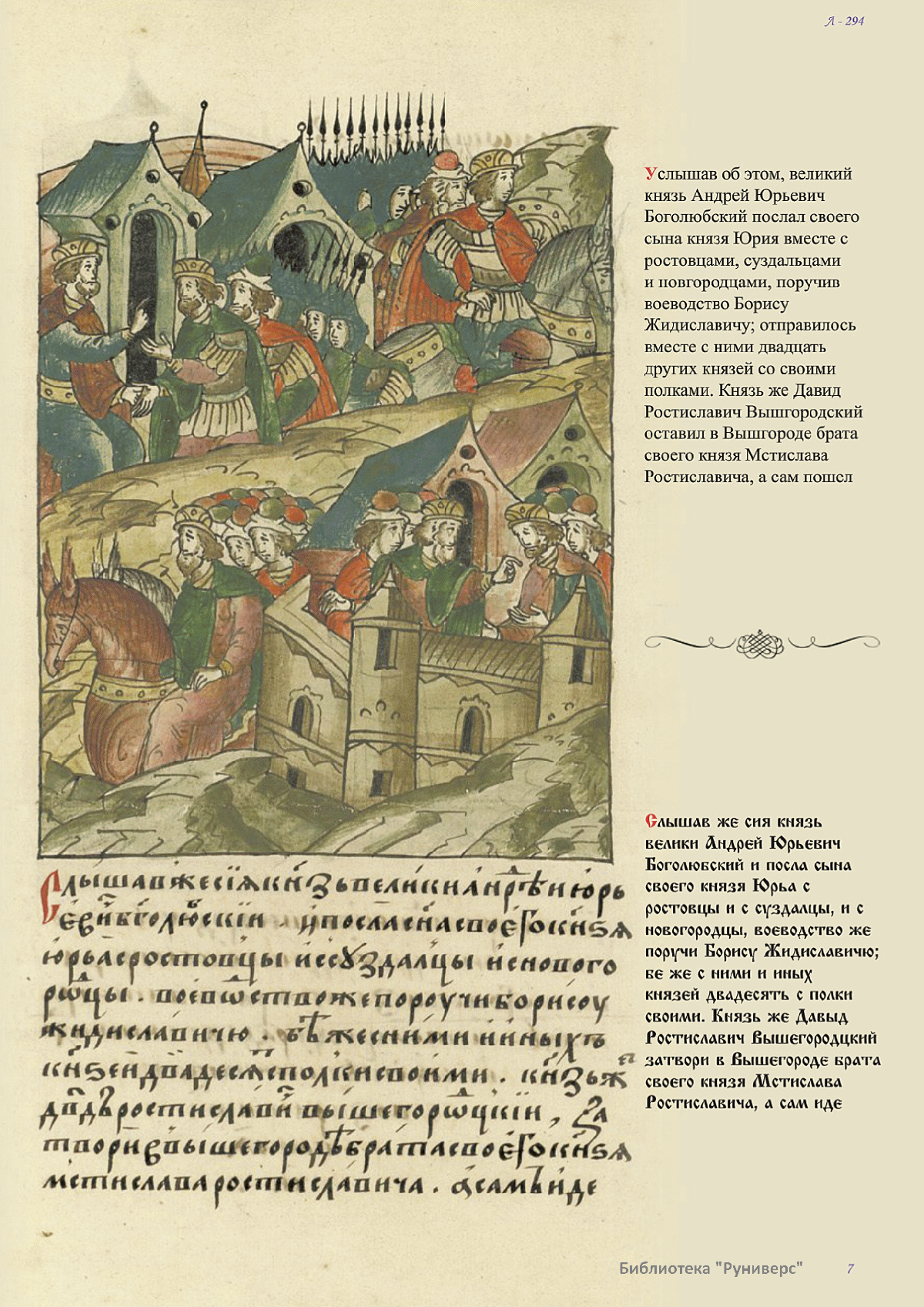 Лицевой летописный свод. XVI века — монументальный памятник древнерусского книжного искусства. На 10 тысячах листов с более чем 17 тысячами красочных миниатюр — «окон в историю» — представлена самая ранняя историческая и литературная энциклопедия. Лицевой свод дошел до наших дней в 10 томах, находящихся в разных древлехранилищах: БАН к РНБ в Санкт-Петербурге и ГИМ в Москве. Фирма «АКТЕОН» совместно с хранителями впервые осуществила научное факсимильное издание «Лицевой летописный свод XVI века». Предлагаемое издание с переводом — как дополнение в рамках научного аппарата вышеназванного факсимиле - представлено тремя разделами: библейская история, всемирная история, русская летописная история. В настоящем издании листы расположены в хронологическом порядке повествования На внешнем поле размещены транслитерация и перевод на современный русский язык. Русская летописная история 1114—1567 гг. — отражена на 6010 Лицевого летописного свода XVI века в следующих его томах: Г — Голицынский том (Отдел рукописей Российский национальной библиотеки, F.IV.225), Л — Лаптевский TOM (Отдел рукописей Российской национальной библиотеки, F.IV.233), O-I — Остермановский первый том (Отдел рукописей Библиотеки Академии наук, 31. 7. 30-1), O-II — Остермановский второй той (Отдел рукописей Библиотеки Академии наук, 31, 7. 30-2), Ш — Шумиловский том (Отдел рукописей Российской национальной библиотеки, F, IY. 232), С — Синодальный том (Отдел рукописей Государственного Исторического музея. Син. № 962), Ц— Царственная книга (Отдел рукописей Государственного Историческою музея. Син. № 149). В сносках отряжены разночтения с перепей ПСРЛ — Полным собранием русских летописей - фундаментальной для изучения истории древней и средневековой Руси книжной серией (её тексты, в основном, издавались наборно, в орфографии XIX века).