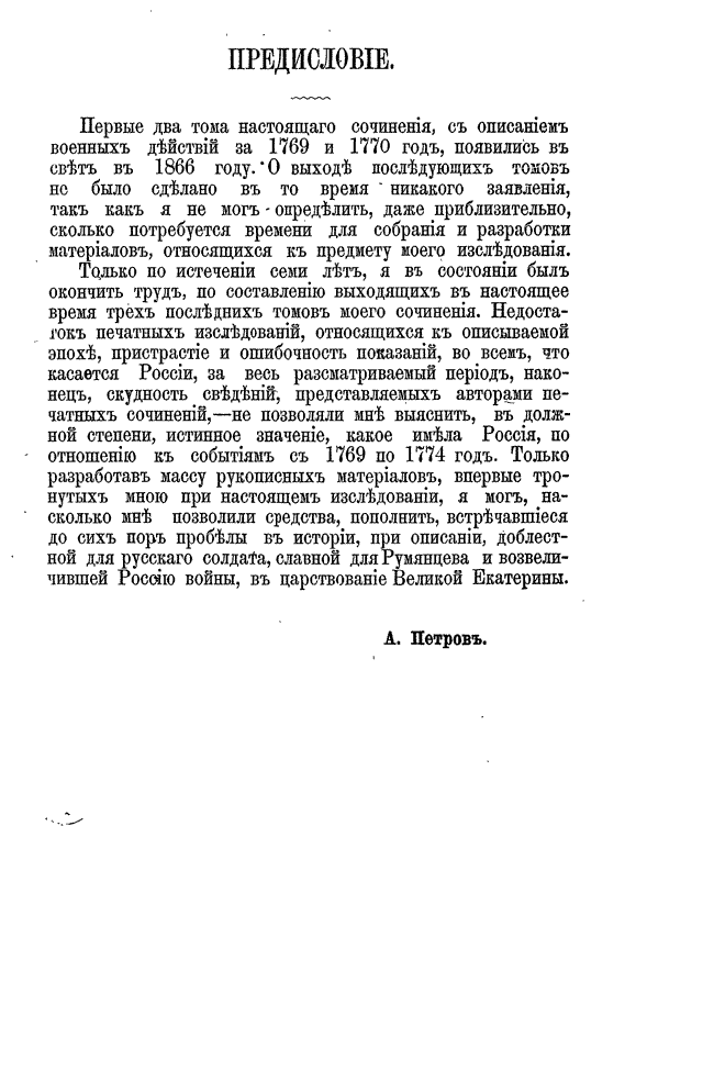 Предпринимая описание первой турецкой войны, в царствование Екатерины II, автор старался изложить военные и политические события того времени с возможною полнотой, насколько это позволяли известные ему рукописные материалы архивов, генерального штаба, государственного и министерства иностранных дел. Петрову посчасливилось одним из первых разбирать дела управления графа Румянцева, только переданные в архив генштаба.