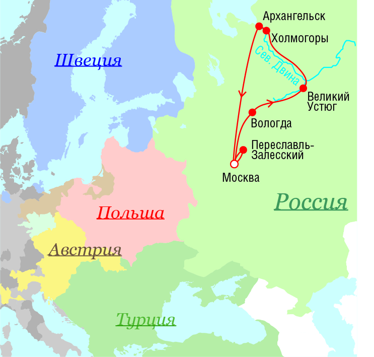 На карте указаны маршруты путешествий Петра I на каждый год. Расстояния приблизительно вычислены по российским дорожникам XVIII и XIX вв. Различия в длине маршрутов Петра и современного пути объясняются другой сеткой дорог. Длина маршрутов, на которые данные дорожников отсутствуют, была определена по электронным картам.