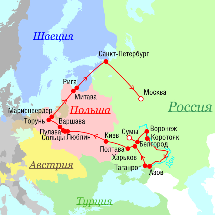 Маршруты поездок Петра I