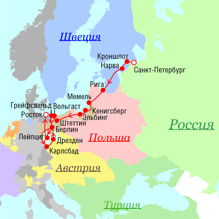 На карте указаны маршруты путешествий Петра I на каждый год. Расстояния приблизительно вычислены по российским дорожникам XVIII и XIX вв. Различия в длине маршрутов Петра и современного пути объясняются другой сеткой дорог. Длина маршрутов, на которые данные дорожников отсутствуют, была определена по электронным картам.