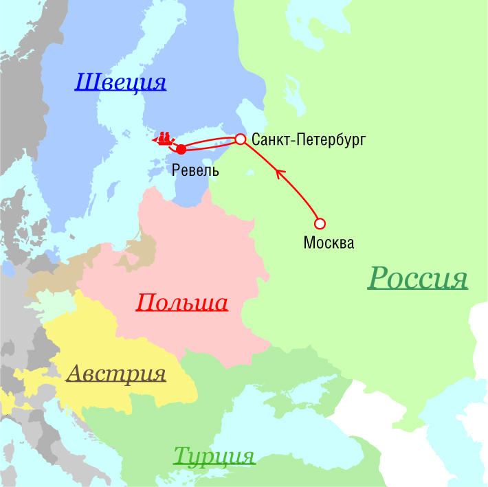 Маршрут поездок Петра I - 1719 г.