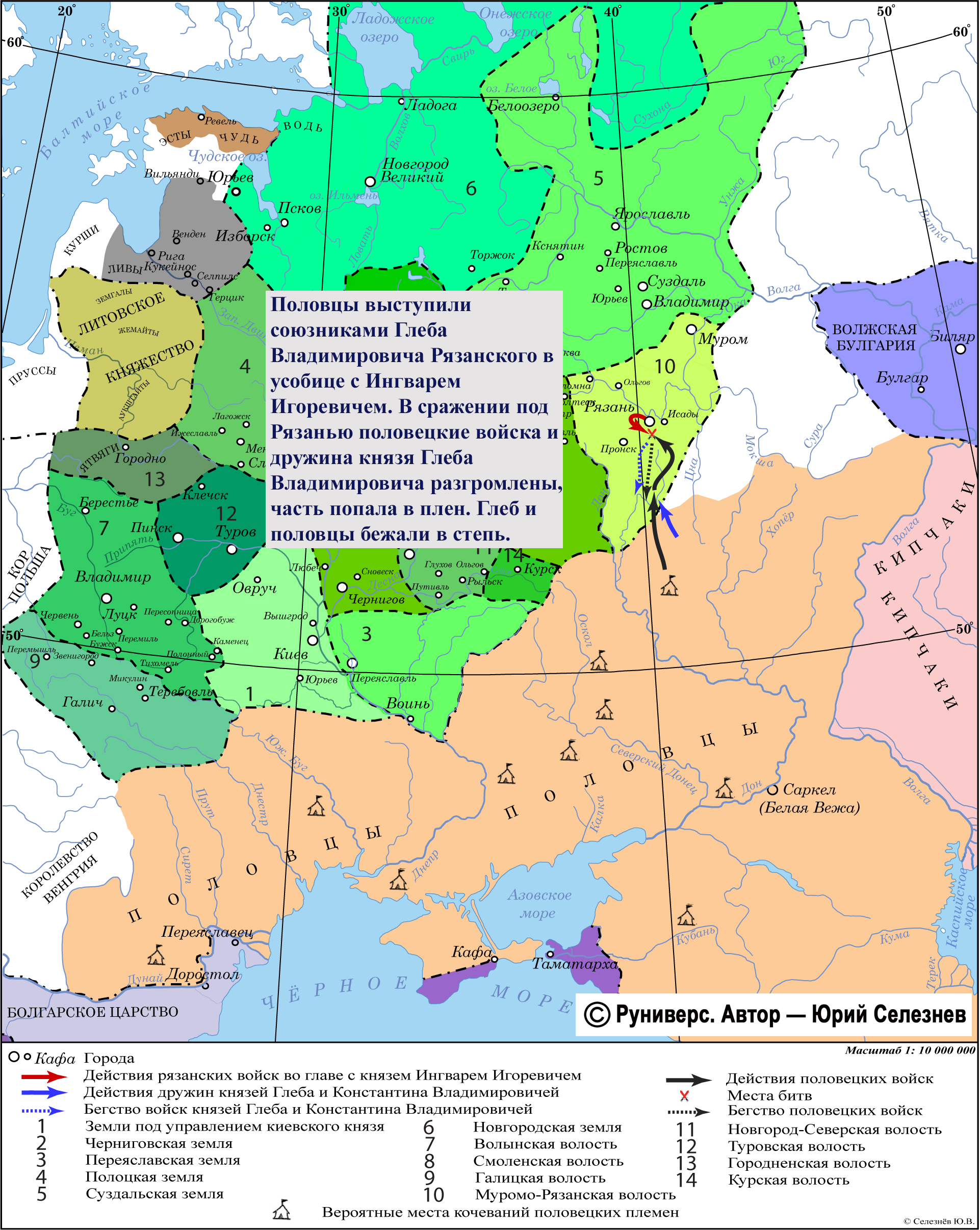 Половцы выступили союзниками Глеба Владимировича Рязанского в усобице с Ингварем Игоревичем. В сражении под Рязанью половецкие войска и дружина князя Глеба Владимировича разгромлены, часть попала в плен. Глеб и половцы бежали в степь.