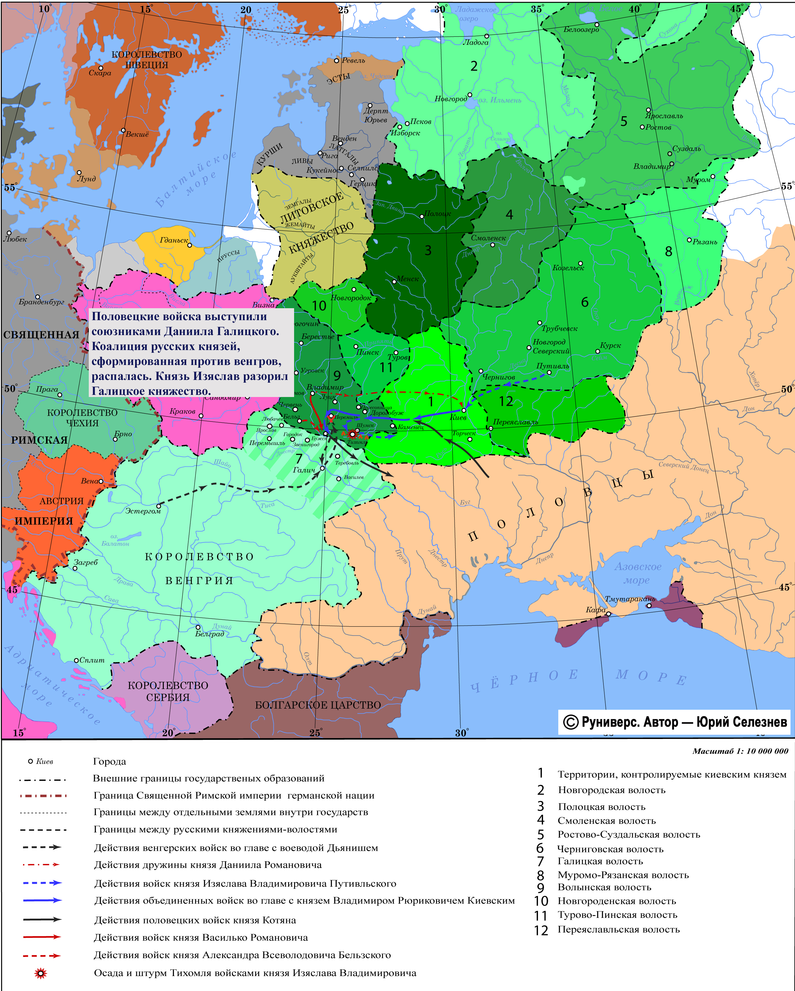 Половецкие войска выступили союзниками Даниила Галицкого. Коалиция русских князей, сформированная против венгров, распалась. Князь Изяслав разорил Галицкое княжество.