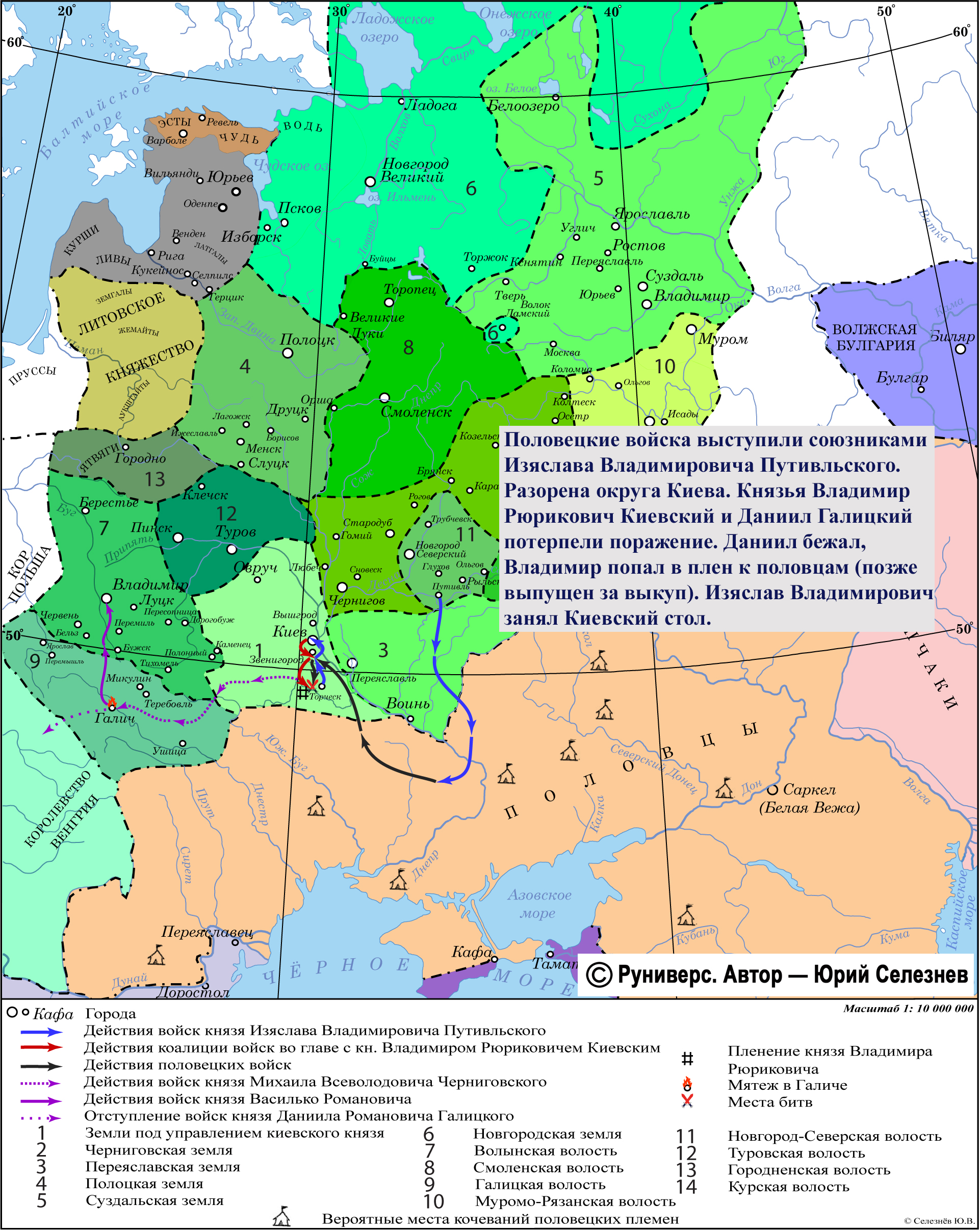 Половецкие войска выступили союзниками Изяслава Владимировича Путивльского. Разорена округа Киева. Князья Владимир Рюрикович Киевский и Даниил Галицкий потерпели поражение. Даниил бежал, Владимир попал в плен к половцам (позже выпущен за выкуп). Изяслав Владимирович занял Киевский стол.
