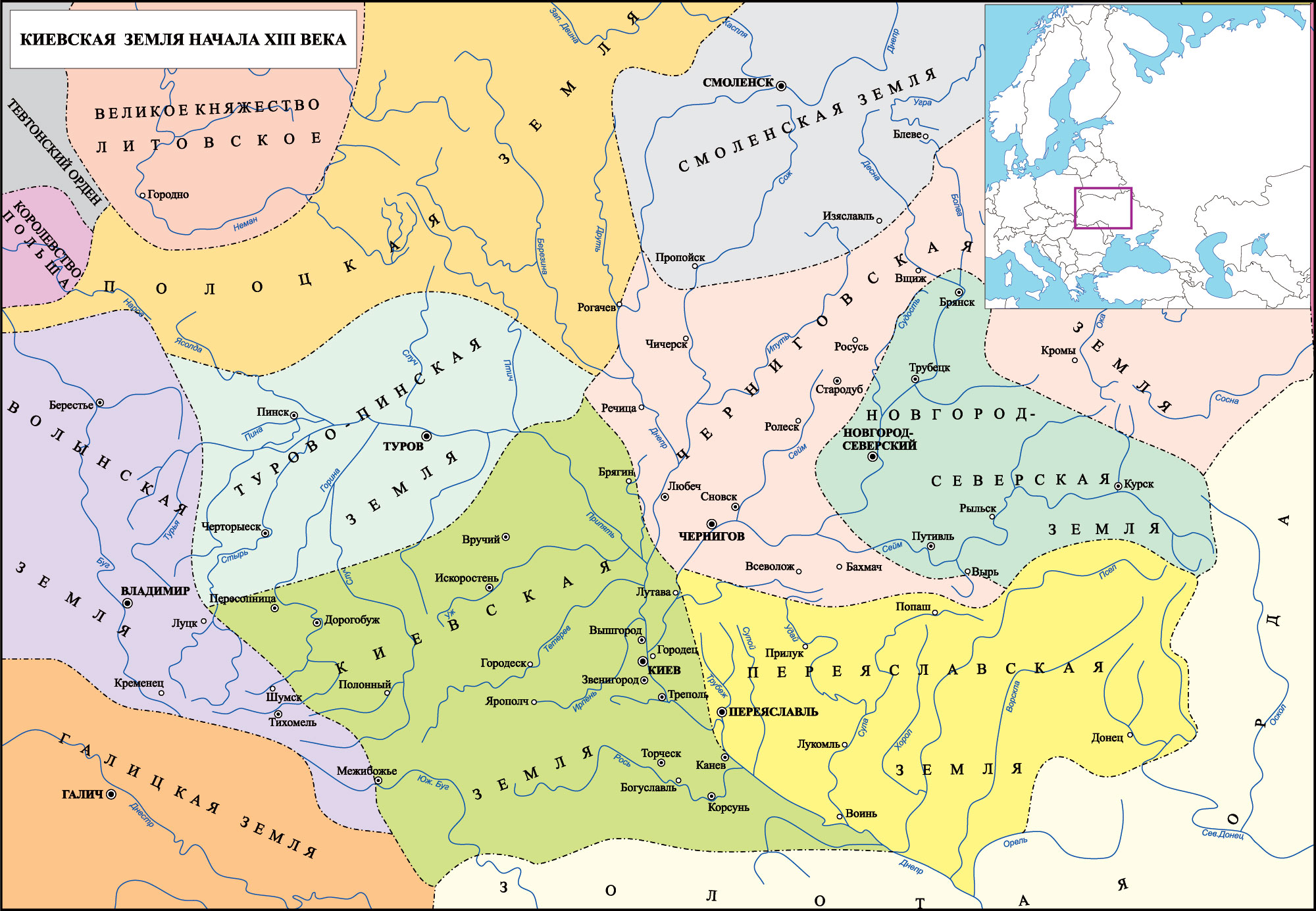 Киевская земля в период с конца IX до середины XIII столетия занимала центральное место в политической и территориальной структуре Руси. Изначально являясь ядром государства под непосредственным управлением главы династии Рюриковичей, к середине XI века она претерпела трансформацию границ. С выделением Черниговской и Переяславской волостей в самостоятельные владения прямая власть киевского князя сосредоточилась в Среднем Поднепровье (земли полян) и на правобережье Днепра (бывшая земля древлян). Несмотря на относительное уменьшение площади, регион оставался наиболее густонаселенным и хозяйственно освоенным: к началу XIII века здесь фиксируется 115 укрепленных поселений, что обеспечивало Киевщине первое место на Руси по плотности застройки.